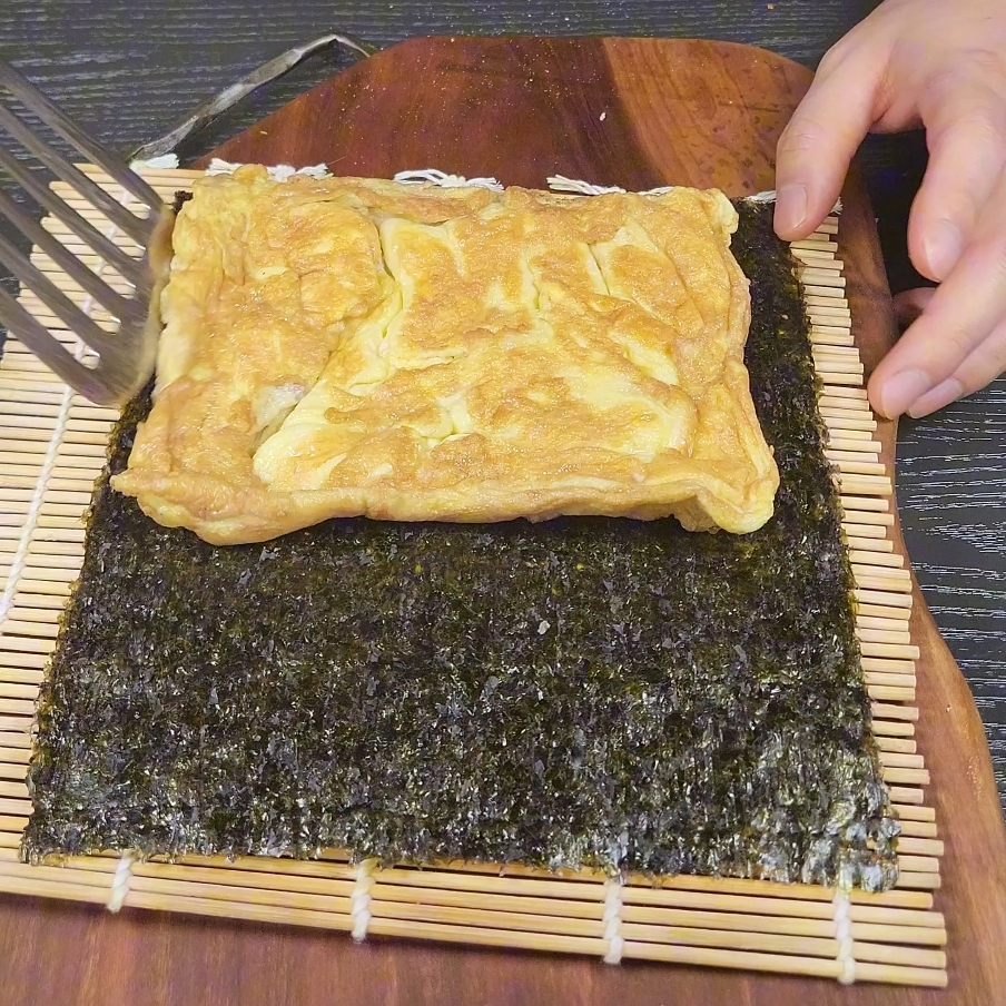 7. 사각 팬에 계란을 두툼하게 구워줍니다. 사각 팬이 없다면 김밥에 넣을 사각형 모양으로 잡아주면서 구워주면 됩니다.