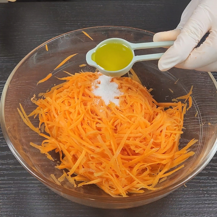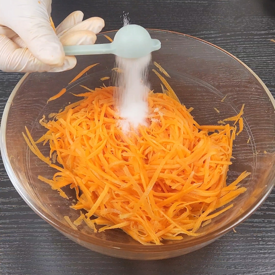 3. 채 썬 당근을 그릇에 담아 소금 반 스푼 넣고 20~30분 정도 절인 다음 물기를 꽉 짜줍니다.