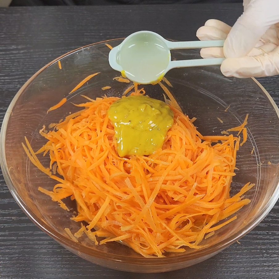 재료 : 당근 2개, 올리브오일 2스푼, 설탕 1스푼, 레몬즙 1스푼, 홀그레인머스타드 2스푼, 소금 0.5스푼, 김밥김 1장, 계란2개
