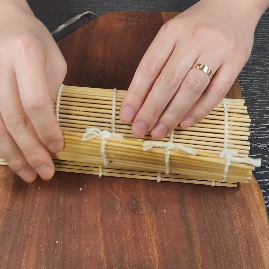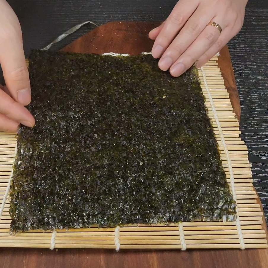 8. 김밥 김을 거친 부분이 안쪽으로 오도록 하고 매끈한 부분을 바깥쪽으로 오게 만들어서 깔아줍니다.